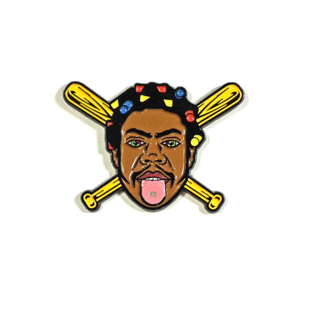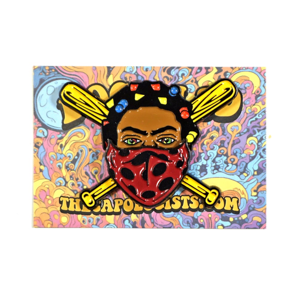 This soft enamel pin is 1.5 inches wide with a black metal finish.