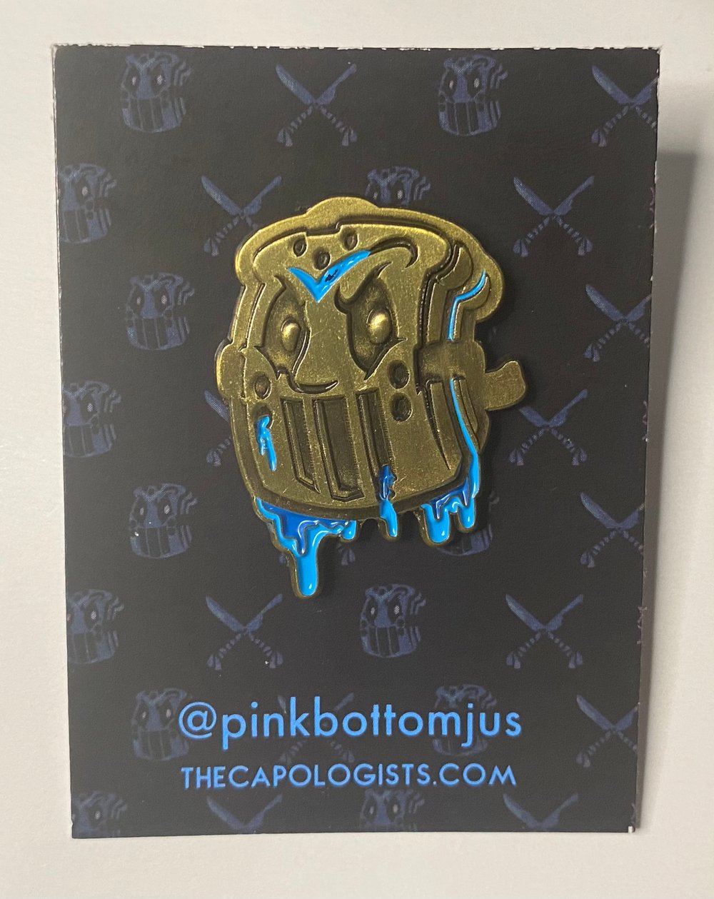 This soft enamel pin is 1.25 inches tall with an antique gold metal finish.