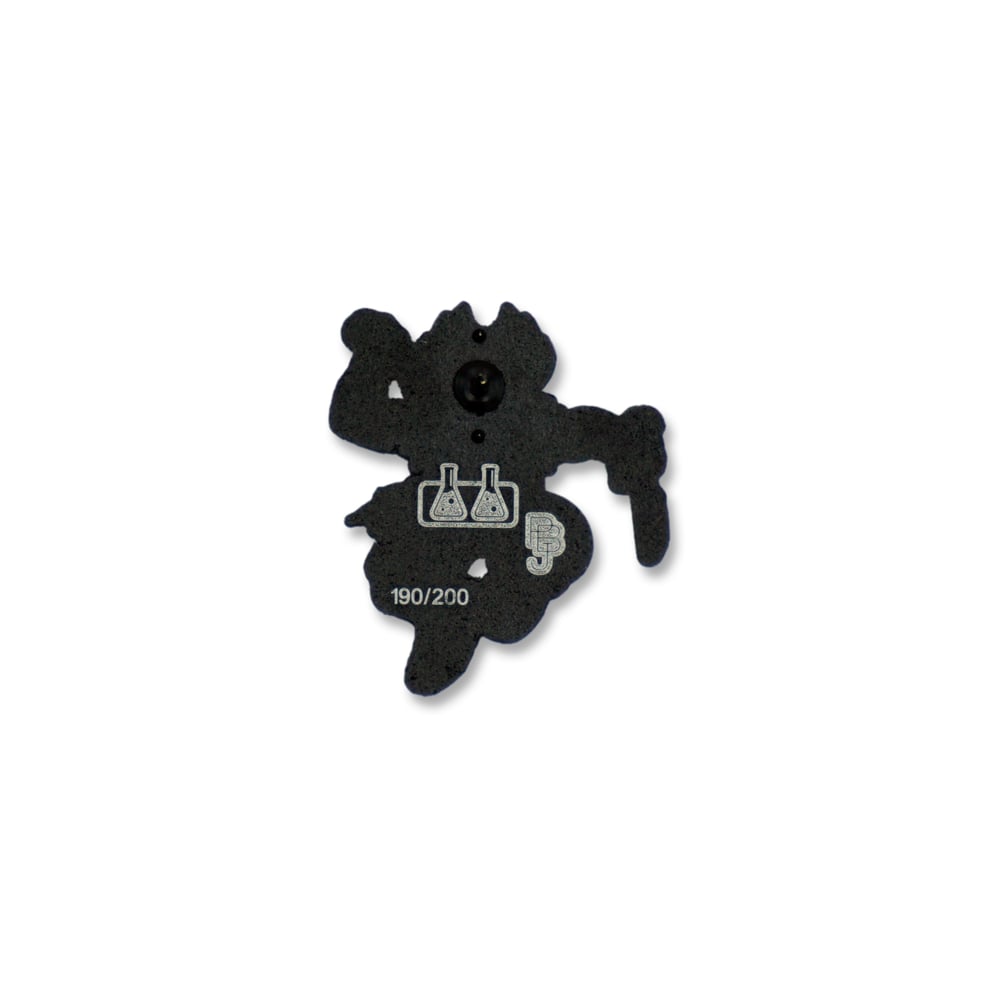 This soft enamel pin is 1.25 inches tall with an black metal finish. Each pin is individually numbered to 200 and comes on a special Spot UV card back.